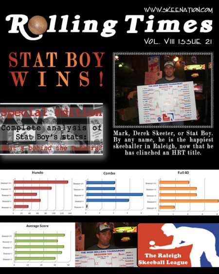 Mark Tichenor joined the league way back in like Skeeson III I think. After a few skeesons, he still didn’t have a nickname and started pushing for Derek Skeeter as his monicker. A few people acquiesced, but for the most part it wasn’t sticking. But the one thing that was sticking was that everyone noticed how up on top of the skee stats he was. He could tell you where your team ranked, what the team in front of you and behind you had, and it was even more accurate when it came to individual stats. He was like the rain man of skee stats. And hence, the name Stat Boy started floating around, and before you know it, it was sticking like crazy.
